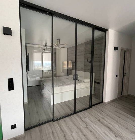 - Стекло. Добавляет света и лёгкости, но снижает приватность и обычно ухудшает изоляцию — для спальни и кабинета чаще выбирают глухие полотна.